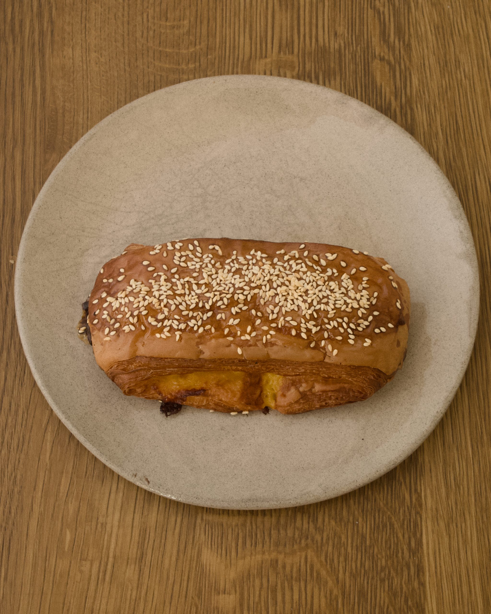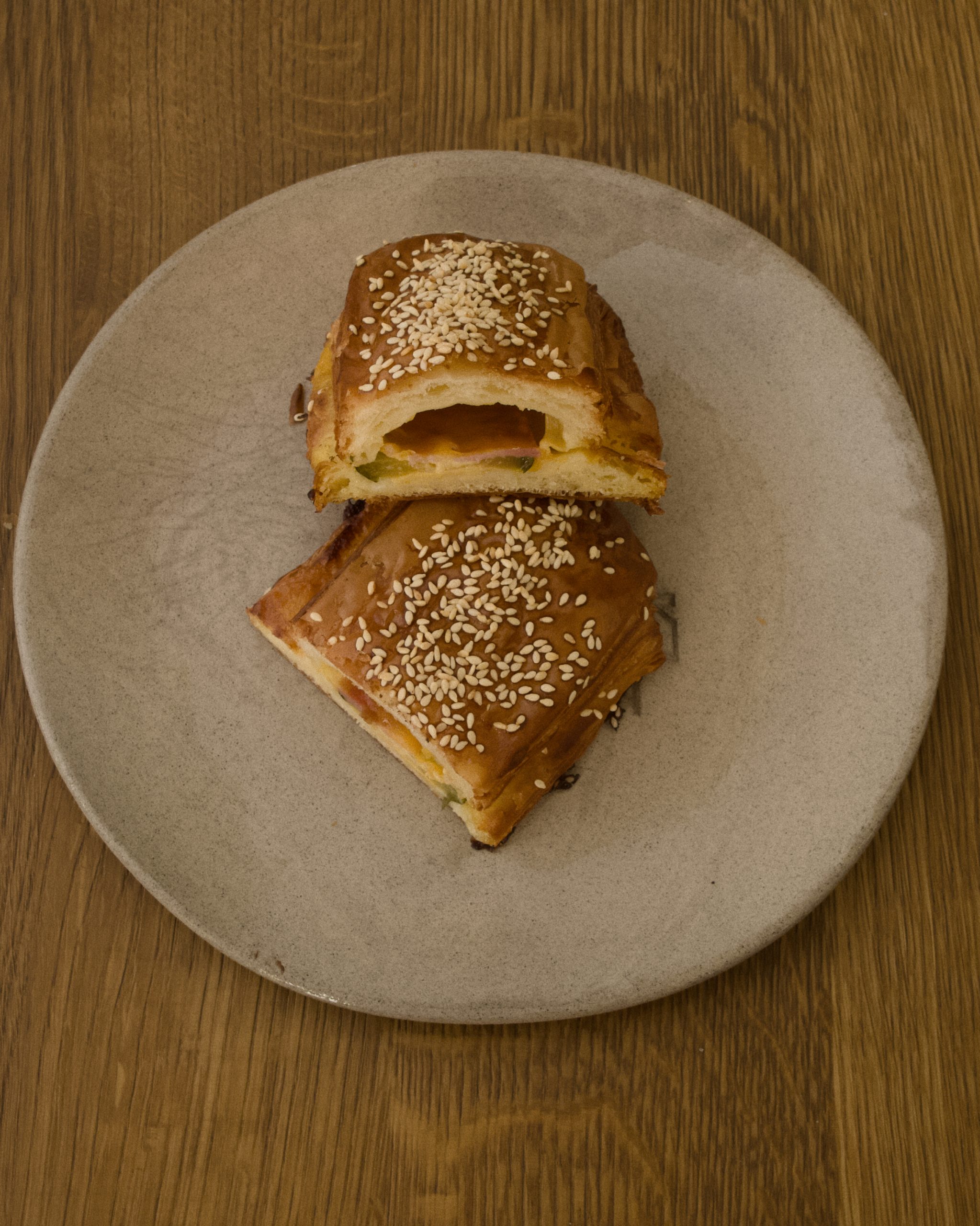 A klasszikus vajas croissant sós változata, amely gazdag és harmonikus ízvilágot kínál. A leveles tésztába gondosan válogatott gouda sajtot és prágai főtt sonkát töltünk, amelyet mustár és csemegeuborka egészít ki, így egyensúlyt teremtve a krémes, sós és enyhén savas ízek között.